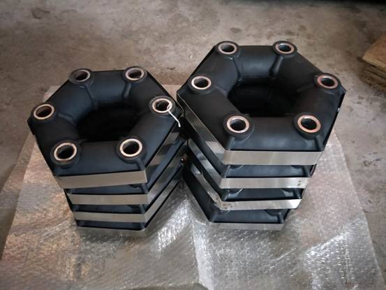 三、(一)產品說明:滄州天碩多角形橡膠聯軸器是用橡膠材料,作成截面為圓形的6角(或8角)形的彈性件,在每一處嵌有與橡膠硫化后粘結在一起的套管,利用穿過套管的6個(或8個)螺栓,交錯地與主、從動端上的半聯軸器凸緣聯結.多角形橡膠聯軸器結構簡單,不用潤滑,裝拆方便,具有緩和傳動軸系的扭轉振動和沖擊載荷,防止傳動軸系共振并能補償兩軸線相對偏移的性能,適用于中等轉矩50-8000N.M的輕工,工程機械,礦山機械等行業,適用于有粉塵,水分的工況環境,工作溫度為-30-60C,用于振動篩的聯接,效果顯著.