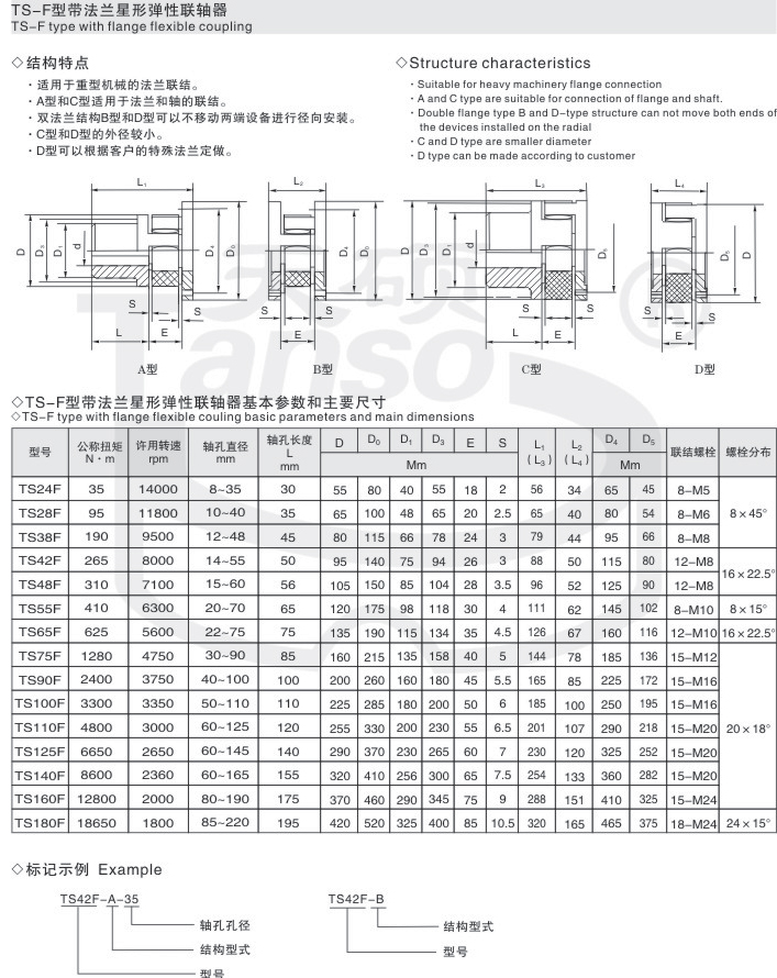2.星形彈性聯軸器主要適用于起動頻繁、正反轉、中高速、中等扭矩和要求高可靠性的工作場合,例如:冶金、礦山、石油、化工、起重、運輸、輕工、紡織、水泵、風機等。工作環境溫度 -35℃~+80℃,傳遞公稱扭矩20~35000Nm,許用轉速1500~15300r/min。